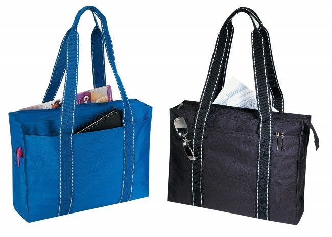 This Custom Tote Bag is made of 600D polyester with heavy vinyl backing. It has a main compartment with zippered closure. It features an inside zippered pocket, front slip pocket, back slip pocket, and dual side slip pockets. The Polyester Tote Bag comes with dual carrying handles for extra support and durability with heavy loads.
